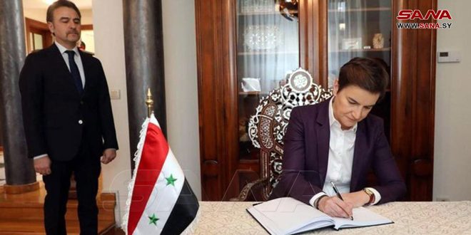 قدمت رئيسة وزراء جمهورية صربيا السيدة انا برنابيتش العزاء بضحايا الزلزال المدمرالذي تعرضت له سورية في الـ 6 من شباط الجاري، خلال زيارتها لمقر السفارة السورية في بلغراد.