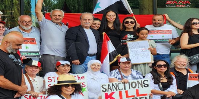 ورفع المشاركون في الوقفة التضامنية مع سورية، بينهم مجموعة “ارفعوا أيديكم عن سورية” الأسترالية لافتات تعبر عن مشاعر الألم والغضب من استمرار الحصار الجائر على سورية، مؤكدين الوقوف مع سورية وحق الشعب السوري بالعيش الكريم وممارسة حياتهم الطبيعية بعد هذه الأزمات والكوارث المتتالية، ومرددين هتافات مشتركة تطالب برفع الحظر والحصار الجائر عن سورية.