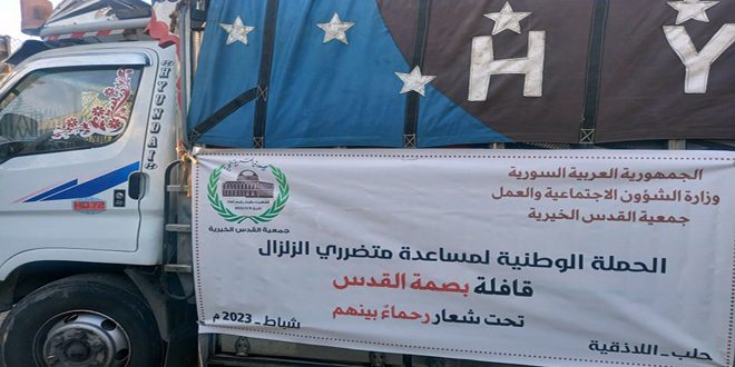 سيرت جمعية القدس الخيرية اليوم بالتعاون مع وزارة الشؤون الاجتماعية والعمل قافلة مساعدات تحمل احتياجات ضرورية للمتضررين من الزلزال في محافظة حلب.