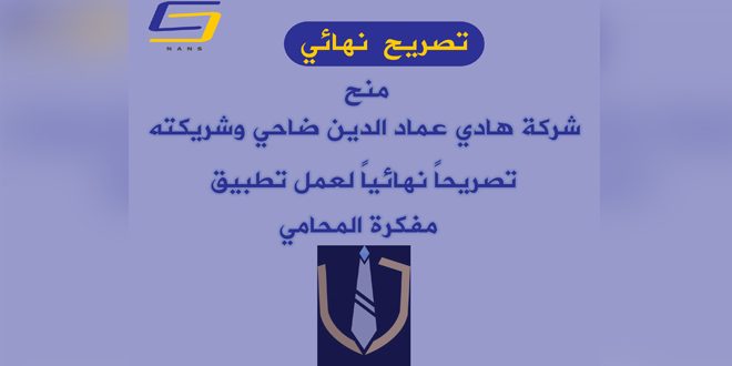 منحت الهيئة الوطنية لخدمات الشبكة اليوم تصريحاً نهائياً لعمل تطبيق (مفكرة المحامي)، للعمل على الشبكة السورية، وذلك بعد حصوله على موافقة نقابة المحامين.
