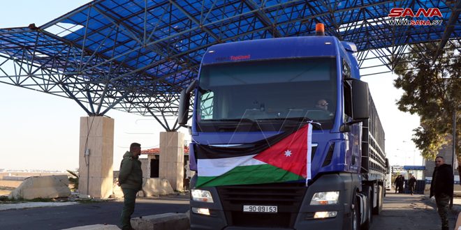 وصلت مساء اليوم إلى معبر نصيب الحدودي قافلة مساعدات محملة بـ 54 طناً من المواد الإغاثية ومستلزمات الإيواء للمحافظات السورية المتضررة من الزلزال، مقدمة من الحكومة الأردنية والهيئة الخيرية الأردنية الهاشمية.