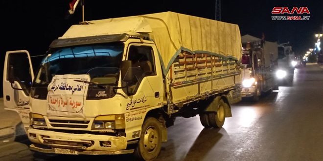 وصلت إلى حلب مساء اليوم قافلة مساعدات إنسانية قادمة من درعا، مؤلفة من 17 شاحنة تحمل مواد غذائية وطبية وأغطية لمتضرري الزلزال.