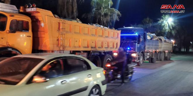 وتضمنت القافلة وفق مدير الشؤون الاجتماعية والعمل ابراهيم خلف بتصريح لمراسل سانا، 11 شاحنة محملة بمختلف أصناف المواد الإغاثية من تجهيزات طبية وألبسة شتوية وحرامات وإسفنج وفرشات وبيدونات وغيرها.