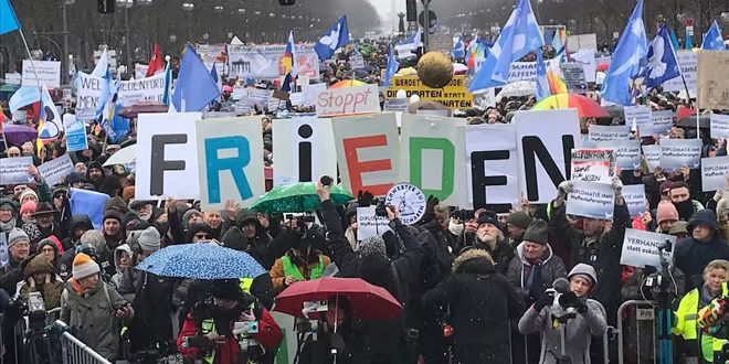 تظاهر آلاف الأشخاص وسط العاصمة الألمانية برلين اليوم رفضاً لاستمرار الدعم العسكري الألماني والغربي للنظام في كييف.
