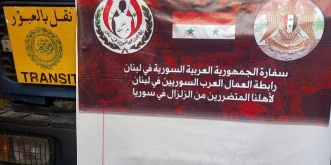 انطلقت مساء اليوم قافلة مساعدات إنسانية نظمتها رابطة العمال السوريين في لبنان، بإشراف وتنسيق مع السفارة السورية في بيروت، لمساعدة منكوبي الزلزال في مدينة حلب.