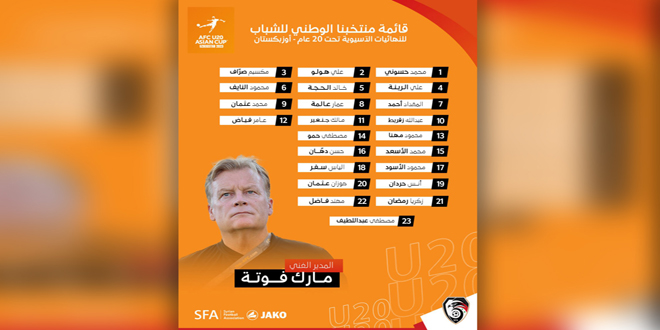 وتضم بعثة منتخبنا الشاب 23 لاعباً وهم محمد حسوني وعلي هولو، ومكسيم صراف وعلي رينة وخالد الحجة ومحمود النايف ومقداد أحمد وعمار عالمة ومحمد عثمان وعبد الله زقريط ومالك جنعير وعامر فياض ومحمود مهنا ومصطفى حمو ومحمد أسعد وحسن دهان ومحمود الأسود وزكريا رمضان ومهند فاضل والياس سفر وأنس حردان وهوزان عثمان ومصطفى عبد اللطيف.
