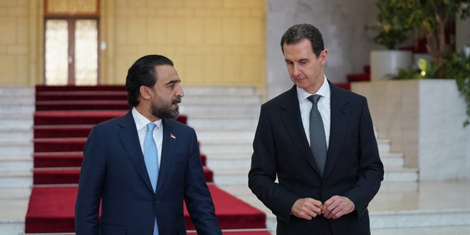 أكّد السيد الرئيس بشار الأسد خلال لقائه اليوم رئيس الاتحاد البرلماني العربي رئيس مجلس النواب العراقي محمد الحلبوسي على العلاقات الأخوية بين سورية والعراق، مشيراً إلى أنّ الامتداد الجغرافي والشعبي بين البلدين يجعل الشعبين يعيشان تحديات متشابهة وتجمعهما مصالح مشتركة، ومن هنا تأتي أهمية دور برلمانَي البلدين كداعم للعمل الرسمي من أجل تعزيز التعاون الثنائي في المجالات التي تنفع الشعبين وتحقق مصالحهما.