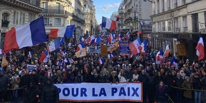 تظاهر آلاف الأشخاص في العاصمة الفرنسية باريس اليوم رفضاً لاستمرار الدعم العسكري الغربي لنظام كييف.