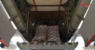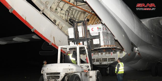 ومن مطار دمشق الدولي أوضحت مراسلة سانا أنه وصلت اليوم طائرة مساعدات إماراتية تحمل 31 طناً و 920 كيلوغراماً من المواد الغذائية وعبوات المياه.