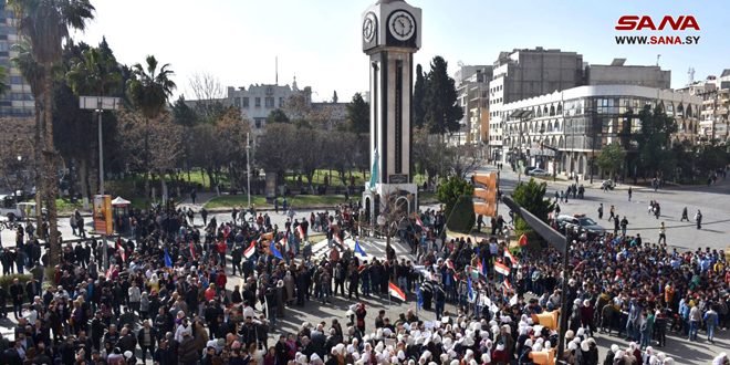 وقال ماجد السيد من عشيرة النعيم في مدينة السلمية: أتينا لنطالب برفع الحصار عن سورية وعن أطفالها، فهي بلد الأمن والأمان ولن تنالوا منها ومن صمود الشعب السوري.