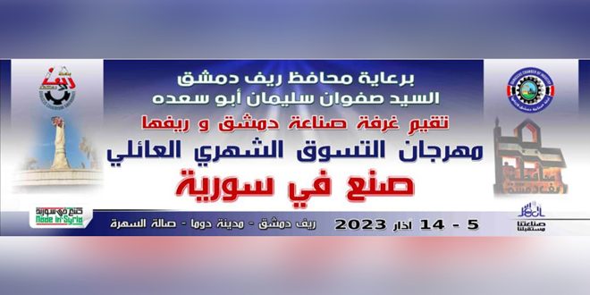 تنطلق غداً فعاليات الدورة الـ 141 من مهرجان التسوق الشهري “صنع في سورية” الذي تنظمه غرفة صناعة دمشق وريفها، وذلك في مدينة دوما بريف دمشق.