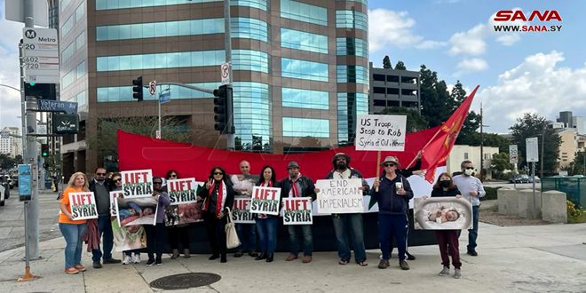 طالب عدد من أبناء الجالية السورية والعربية والمتضامنين الأمريكيين خلال وقفة احتجاجية في مدينة لوس أنجلوس الأمريكية برفع الحصار وجميع الإجراءات القسرية أحادية الجانب المفروضة على سورية.