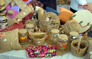 ويضم المعرض أعمالاً تجمع بين المنتجات الغذائية المتعلقة بالمؤونة المنزلية والتراثية والمطرزات والألبسة الصوفية والمنظفات والكريمات والعطورات والإكسسوار والشموع والمجسمات الخشبية، إضافة لعدد من اللوحات الفنية.