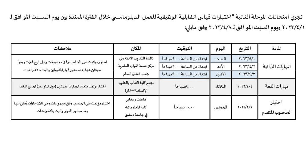 ولفتت الوزارة في إعلانها إلى أنه ستجري امتحانات المرحلة الثانية اختبارات قياس القابلية الوظيفية للعمل الدبلوماسي، اعتبارا من الأول من نيسان القادم وحتى الـ 8 منه.