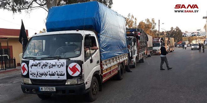 وذكر جاد منذر منفذ عام الطلبة الجامعيين ببيروت في الحزب لمراسل سانا أن هذه القافلة هي السابعة التي يقدمها الحزب، وهي تضم ست شاحنات تحوي مواد لوجستية ومواد غذائية وأدوية مقدمة للأهالي في حلب، وهي تأتي انطلاقاً من إيمان الطلبة الجامعيين بوحدة الشعبين السوري واللبناني المتجذرة، وأقل واجب تجاه المتضررين في المحافظات المنكوبة.