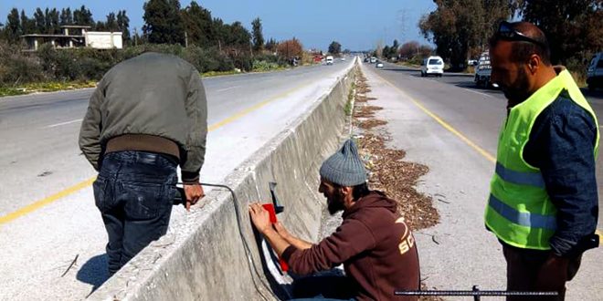 تقوم ورشات المؤسسة العامة للمواصلات الطرقية فرع طرطوس بتركيب لوحات جسور وكفوف عاكسة على أتوستراد حمص_طرطوس الدولي، بالقرب من مصفاة حمص لضمان السلامة المرورية.
