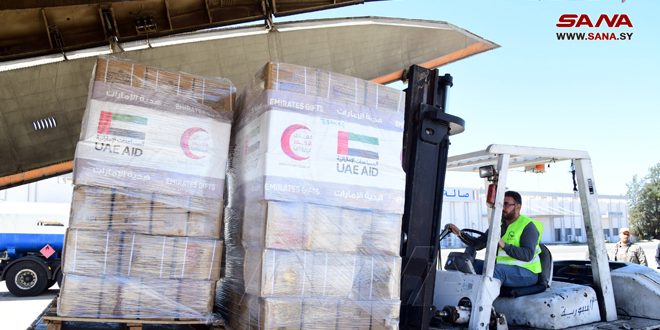 وصلت اليوم إلى مطارات دمشق وحلب واللاذقية الدولية خمس طائرات من الإمارات وإيران وروسيا محملة بالمواد الإغاثية والغذائية والمساعدات الإنسانية لمتضرري الزلزال.