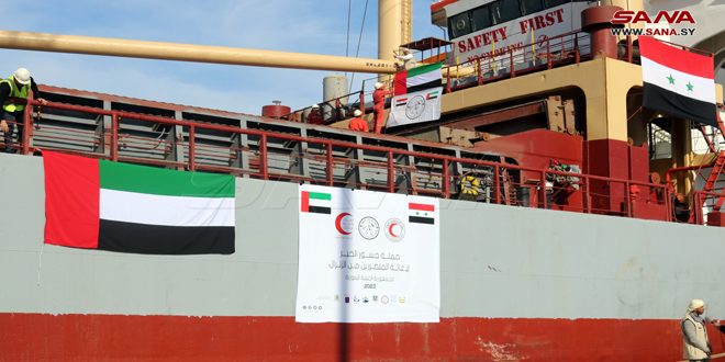 وصلت اليوم إلى ميناء اللاذقية سفينة محملة بنحو 1000 طن من المواد الإغاثية، مقدمة من الهلال الأحمر الإماراتي ضمن حملة جسور الخير لدعم المتضررين من الزلزال.
