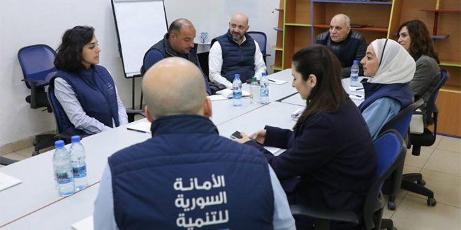 عقد نائب وزير الدفاع رئيس لجنة الإدارة المشتركة لمشروع جريح الوطن العماد محمود الشوا اليوم اجتماعاً مع الرئيس التنفيذي للأمانة السورية للتنمية وفريق مشروع جريح الوطن في حلب.