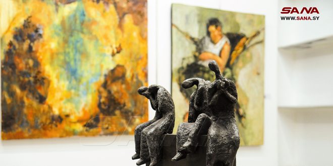 بدورها النحاتة الشابة سالي أرسوزي خريجة قسم النحت بكلية الفنون الجميلة عام 2016، جاءت مشاركتها الثانية في معرض جماعي عبر عملين من مجموعة نحتية، تحكي عن المعاناة والألم والفقد من وحي سنوات الحرب على سورية، بخامة البوليستر وبأسلوب تعبيري يجسد أشخاصاً بحالات إنسانية متعددة.
