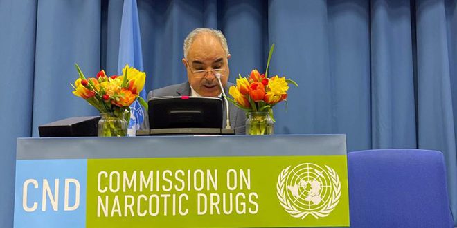 وأشار السفير خضور إلى أن سورية عانت مطولاً من مشكلة المخدرات العابرة لحدودها، وموقعها الجغرافي جعلها ممرّاً إجبارياً لعبورها وتهريبها بين دول المنشأ ودول المقصد، مضيفاً: “إن هذه المشكلة تنامت في السنوات الأخيرة، بفعل سيطرة التنظيمات الإرهابية المدعومة من عدة دول على بعض المناطق الحدودية، ونشاط الجماعات الإجرامية العابرة للحدود، ما أدى إلى خلق مناخ ملائم لنقل وتهريب المخدرات وترويجها، وتوافر عوائد مالية كبيرة ساهمت في تمويل تلك التنظيمات الإرهابية”.