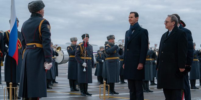 من مراسم الاستقبال الرسمية للرئيس الأسد في مطار ڤنوكوڤا الدولي مبتدئاً زيارة رسمية إلى روسيا