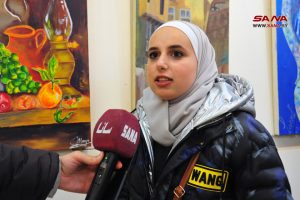 الفنانة الشابة مايا الأحمد شاركت بلوحة طبيعة صامتة تضمنت أواني وأدوات تراثية دمشقية ولفتت إلى أن هذه الأواني القديمة ترمز لأصالة دمشق وعراقتها.