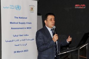 مناقشة الخطة الوطنية لتطوير سلسلة الإمداد والإدارة اللوجستية لتأمين الاحتياجات الأساسية للقطاع الصحي، أبرز محاور ورشة العمل التي نظمتها اليوم وزارة الصحة، بالتعاون مع منظمة الصحة العالمية، وذلك في فندق غولدن مزة بدمشق.