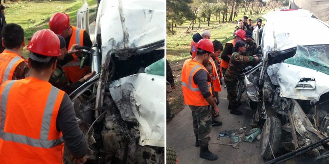 وذكر مدير الدفاع المدني بحمص في تصريح لمراسل سانا أن غرفة عمليات الفرع تلقت نداء استغاثة حول وقوع حادث سير بالقرب من جسر القصير على الطريق الدولي حمص دمشق، ناجم عن اصطدام سيارة شاحنة مع سيارة فان ومحاصرة الركاب داخل الفان، وعلى الفور توجه العناصر إلى المكان وعملوا على إخراج السائق وامرأة بجانبه وإسعافهم إلى المشفى بحمص لتلقي العلاج.