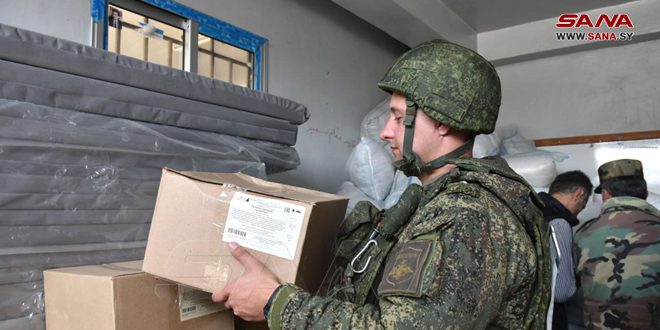 وزعت محافظة حماة اليوم مساعدات غذائية مقدمة من روسيا الاتحادية للمتضررين من الزلزال في مركز إيواء بيصين بريف المحافظة.
