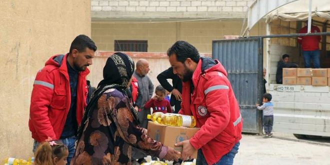 وزع فرع منظمة الهلال الأحمر العربي السوري في الحسكة مساعدات غذائية وألبسة للأهالي القاطنين في 62 مركز إقامة مؤقتة في المدينة.