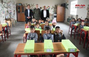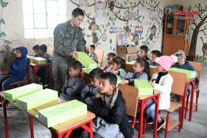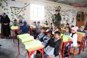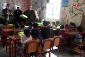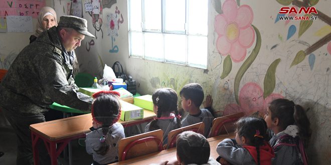 وزع مركز التنسيق الروسي اليوم مساعدات إنسانية على مجموعة من الأطفال في روضة مركز الإقامة المؤقتة ببلدة الحرجلة في ريف دمشق.