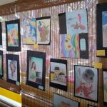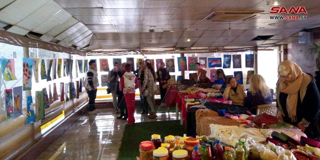 الفنانتان رؤى سلمون وقمر منعم مشاركتان مع عدد من الطلبة بلوحات متنوعة بألوان الإكريليك والخشب وبموضوعات مختلفة تعبر عن طفولتهم ورؤاهم.