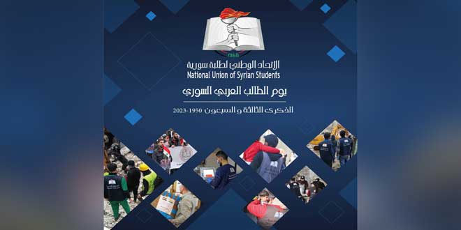 وقال الاتحاد في بيان اليوم بمناسبة الذكرى الـ73 ليوم الطالب العربي تلقت سانا نسخة منه: “في الثلاثين من آذار من كل عام تتجدد الذكرى ويتجدد معها عهد العمل والتفاني بتقديم عظيم الجهد وروح المثابرة والعزيمة وكتابة سطور النجاح والتفوق والتميز والإبداع”.