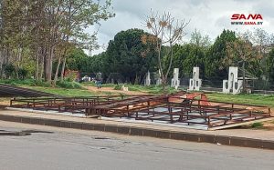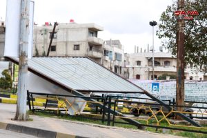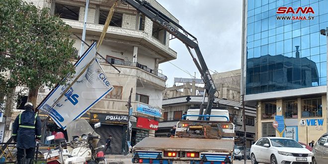 بدأت ورشات مجلس مدينة حمص إزالة الأشجار وتنظيف بقايا الأغصان المتكسرة وأوراق النخيل، ورفع اللوحات الإعلانية وألواح الطاقة الشمسية المتساقطة في عدد من الأماكن بالمدينة، جراء سرعة الرياح الشديدة التي شهدتها المحافظة أمس.