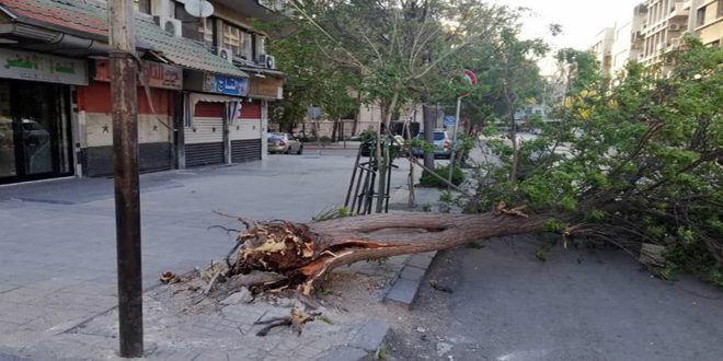 تتابع ورشات المديريات الخدمية في محافظة دمشق منذ ليل أمس أعمال إزالة الأشجار والأغصان وألواح الطاقة الشمسية والعوارض الحديدية المتساقطة في عدد من الأماكن بالمدينة، جراء الرياح الشديدة التي شهدتها العاصمة ليلاً.