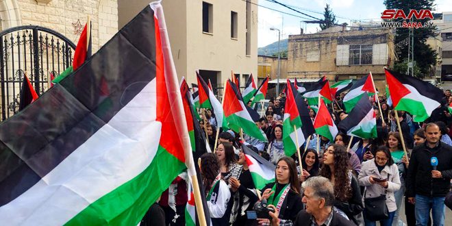 وأوضح مراسل سانا أن المشاركين في المظاهرة التي نظمت في مدينة سخنين رفعوا الأعلام الفلسطينية وصور الشهداء، ورددوا هتافات منددة بجرائم الاحتلال وممارساته بحق الفلسطينيين، مؤكدين تجذرهم بوطنهم وتمسكهم بترابه الذي قدموا في سبيله آلاف الشهداء والأسرى مهما تغطرس المحتل.