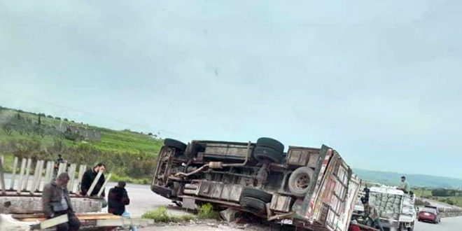 تدهورت صباح اليوم سيارة (شاحنة) على الطريق الدولي حمص طرطوس، بالقرب من موقع جسر بلدة حديدة بريف حمص الغربي، ما أدى إلى تضرر سيارتين بجانبها، إضافة إلى أضرار في منصف الطريق.