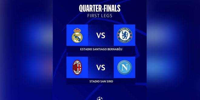 تستكمل اليوم منافسات ذهاب الدور ربع النهائي من دوري أبطال أوروبا بكرة القدم بمواجهتين قويتين، تجمع الأولى ريال مدريد الإسباني وضيفه تشيلسي الإنكليزي، فيما يحل نابولي الإيطالي ضيفاً على مواطنه ميلان.