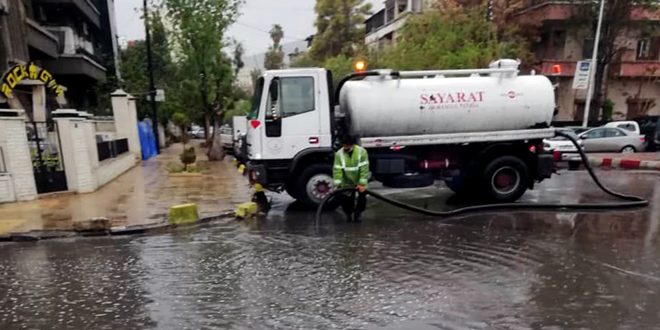 أعلنت محافظة دمشق أن ورشات المديريات الخدمية تقوم منذ ساعات الصباح بمعالجة تجمعات برك المياه في بعض الشوارع والأنفاق، من خلال شفط المياه وتعزيل المطريات، وإزالة الأوساخ التي جرفتها مياه الأمطار الغزيرة المستمرة منذ مساء أمس.