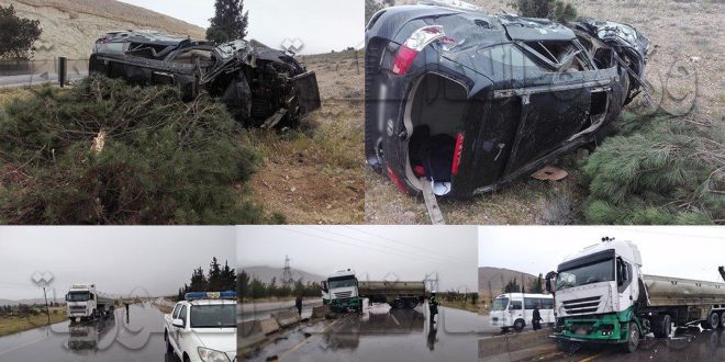 وقالت وزارة الداخلية في بيان اليوم: “إن سيارة خاصة من نوع جيب تدهورت على طريق دمشق حمص بالقرب من قارة، ما أدى إلى إصابة شخصين تم إسعافهما إلى مشفى الباسل في دير عطية”، مشيرة إلى أن سبب الحادث هو السرعة الزائدة.