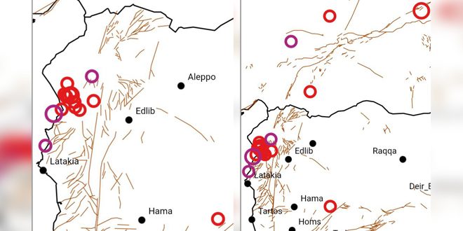 وأوضح المركز في إعلانه على الفيسبوك أنه من الهزات المسجلة في شرق حماة بـ 69 كم بقدر 2.5 درجة، وشمال اللاذقية بـ 22 كم بقدر 2.2 درجة، و7 هزات في لواء اسكندرون بقدر بين 2.3 و3.2 درجات، و3 هزات في البر التركي بقدر بين 2.6 و4.2 درجات.