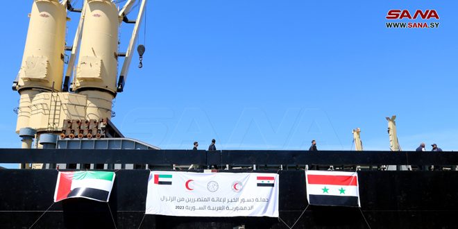 وصلت إلى ميناء اللاذقية اليوم سفينة مساعدات إماراتية، محملة بـ 2215 طناً من المواد الإغاثية والغذائية والصحية للمتضررين من الزلزال.