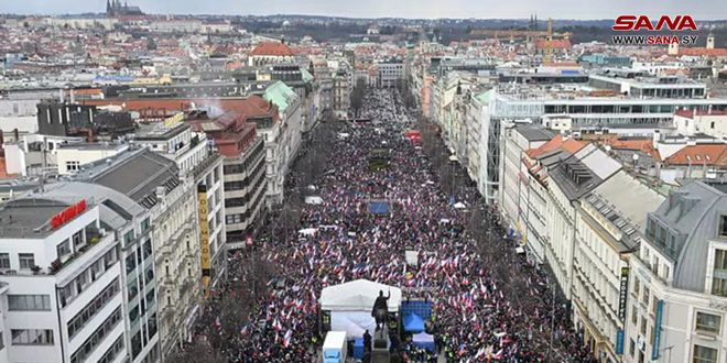 تظاهر آلاف الأشخاص اليوم في عاصمة التشيك براغ، احتجاجاً على سياسة الحكومة التشيكية الداعمة للنظام الأوكراني، في ظل تدهور الأوضاع المعيشية وارتفاع أسعار الطاقة في البلاد.
