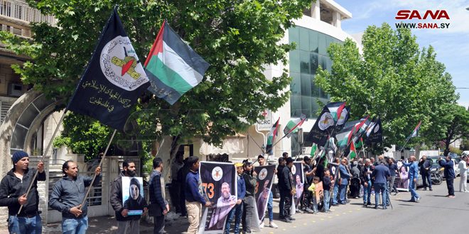 نظمت مؤسسة مهجة القدس للشهداء والأسرى والجرحى ولجنة الدفاع عن الأسرى والمعتقلين الفلسطينيين في سجون الاحتلال الإسرائيلي وفصائل المقاومة الفلسطينية اليوم وقفة تضامنية أمام مقر بعثة اللجنة الدولية للصليب الأحمر بدمشق، دعما لصمود الأسرى الفلسطينيين في معتقلات الاحتلال الصهيوني.