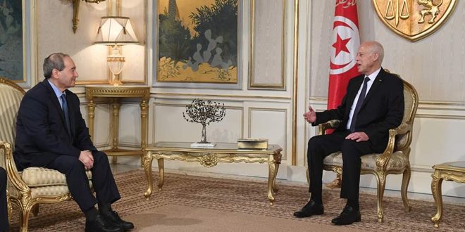 وقدم الوزير المقداد الشكر للرئيس التونسي على دعمه لسورية في حربها ضد الإرهاب ووقوف تونس إلى جانب سورية وأهمية تعزيز العلاقات بينهما لما فيه مصلحة وخدمة الشعبين والبلدين الشقيقين.