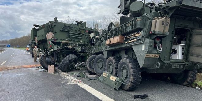 وأوضحت الشرطة في مدينة امبرغ جنوب ألمانيا أن قافلة عسكرية كانت تسير على الطريق السريع (اي6) في مهمة تدريب، ولأسباب لا تزال غير معروفة وقع تصادم خلفي يشمل أربع عربات مصفحة على طريق بين (سولزباتش روزنبيرغ) و(امبرغ) القرب من الحدود التشيكية، ووفقا للنتائج الأولية أصيب سبعة جنود أحدهم في حالة خطرة، تم نقلهم إلى المشفى بمروحية إنقاذ.