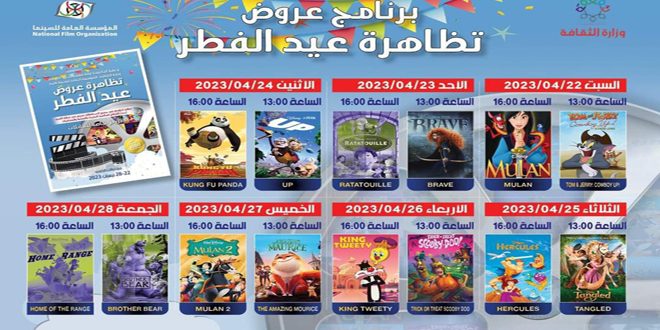 تطلق المؤسسة العامة للسينما تظاهرة عروض عيد الفطر في صالات سينما الكندي في جميع المحافظات.