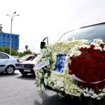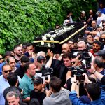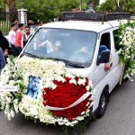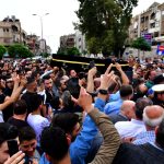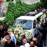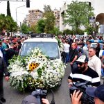 وشيع جثمان الفنان الراحل الذي توفي مساء أمس عن عمر ناهز 49 عاماً إثر احتشاء عضلة القلب من مشفى دار الشفاء مروراً بساحة الأمويين ليصلى على جثمانه في مسجد المزة الكبير ليوارى الثرى في مقبرة المزة.