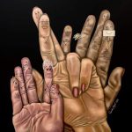 وحول فكرة اللوحة أوضحت حجازي أنها عبرت عن التعاطف من خلال الأيدي والأصابع التي ترمز لتعدد الثقافات في المجتمعات وأهمية العلاقات الإيجابية والداعمة مع المحبة بين الأفراد لبناء مجتمع إنساني سليم ومعافى، مبينة أن فكرة الرسم على الأصابع ليست جديدة، ولكنها استخدمتها لإيصال فكرتها بطريقة جديدة حملت هارموني لوني وقوة بالتعبير.